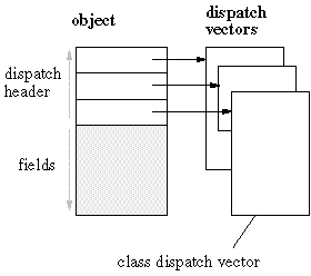 Dispatch vectors are shared by all objects of the particular class that owns them, but each object has its own copy of the dispatch header that points to them. Most objects have only a single dispatch vector, so only one word is consumed by the dispatch header. With the use of inheritance or subtyping, the dispatch header layout grows backward in memory, if it grows at all.