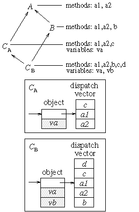 Figure 4 provides examples of bidirectional object layouts for two classes, CA and CB. These classes implement types A and B respectively. The methods and instance variables associated with each type or class are indicated in the diagram. For example, CA supports the methods a1 and a2 of its type A, and adds a private method c. It has one instance variable named va. The figure shows the layouts of objects and the dispatch vectors they point to. The dispatch headers for each of these classes contain a single dispatch vector, which is the class dispatch vector. Note that the CB. object is compatible with the CA object, which is necessary because CB inherits from CA.