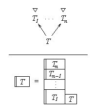 The consequent, below the line, states that the layout for T consists of the concatenated layouts for all the supertypes, except that the last dispatch vector has been extended to include the methods of T that are not shared with T1. The mismatch in the heights of the boxes labeled T and T1 is intentional: the box labeled T represents a single dispatch vector, whereas the box labeled T1 represents a dispatch header that may contain several dispatch vectors. The type T1 is called the primary supertype, since its last dispatch vector is merged with that of T. The types T2...Tn are secondary supertypes.