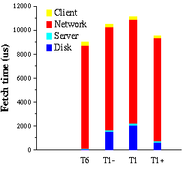 For most system configurations, the cost of foreground replacement and format conversions as a fraction of fetch time will be lower than the values we report. This is clearly true when a slower network is used, e.g., client and server connected by a wireless network or a WAN, but the use of a faster network could presumably increase the relative cost. We believe that the reduction in network time would be offset by the following factors. First, in our experimental configuration, the disk time is only a small fraction of the total fetch time because the hit rate in the server cache is unrealistically high; T1 has the lowest server cache hit rate and it is still 86%. In a configuration with a realistic hit rate of 23% (measured by Blaze [Bla93] in distributed file systems), the foreground replacement overheads in T1- and T1 would be 11% and 16% of the disk time alone. Second, our server was accessed by a single client; in a real system, servers may be shared by many clients, and contention for the servers' resources will lead to even more expensive fetches. Third, our client machine is a DEC 3000/400 with a 133 MHz Alpha 21064 processor, which is slow compared to more recent machines; our overheads will be lower in today's machines. For example, we reran the experiments described in this section on a 200 MHz Intel Pentium Pro with a 256 KB L2 cache. The conversion overheads on this machine relative to the overheads on the Alpha workstation were 33% for T1- and 42% for T1; the foreground replacement overheads were 75% for T1- and 77% for T1. Note that the speedup of the replacement overhead should be larger in a machine with a larger second level cache.
