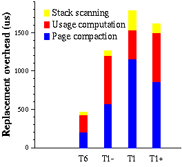 Figure 9 shows the overhead when replacement is performed in the foreground; it is 5% of the fetch time for T6, 12% for T1-, 16% for T1, and 17% for T1+. Since this overhead is much lower than the fetch time, HAC is able to perform replacement with no cost if the processor is idle waiting for the fetch reply; otherwise, the actual replacement cost will be between zero and the foreground replacement overhead reported in Figure 9.