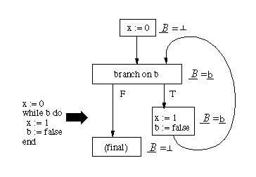 Labels of basic blocks are derived as follows. The decision about which exit point to follow from a block Bi is made based on the observation of some value vi. The label B for a particular basic block B is the join of some of the labels vi. A label vi is included in the join if it is possible to reach B from Bi, and it is also possible to reach the final node from Bi without passing through B (if all paths from Bi to the final node pass through B, then arriving at B conveys no information about vi.) The set of vi that must be included in each B can be efficiently computed using standard compiler techniques. This rule for basic block label propagation is equivalent to the rule of Denning and Denning [DD77].
