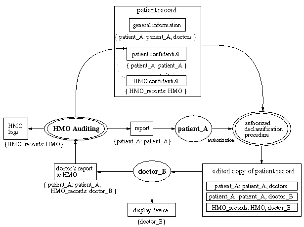 The audit program runs with the authority of the HMO_records principal and thus can store the information with the appropriate labels in the log and the patient record database. It can also send a report to the patient; the designer of the audit program must use mechanisms outside the scope of information flow control to determine either that no HMO-confidential information is leaked or that the leak is acceptably small.