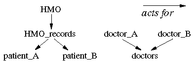 The HMO maintains the patient's medical history; the example tracks information flow as the patient receives medical services. The patient record has three parts: general information about the patient, which is controlled by the patient but is readable by any doctor, private information (such as the medical history), which is normally not readable by doctors, and confidential information that the HMO does not release to patients.