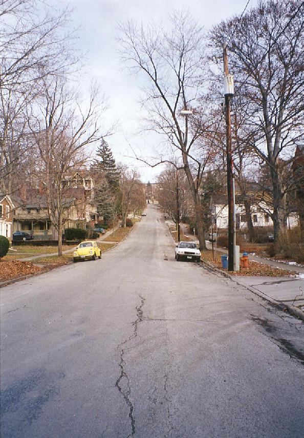 This is a view looking uphill along Seneca Street, one of the main streets in Ithaca. It's actually steeper than it looks.