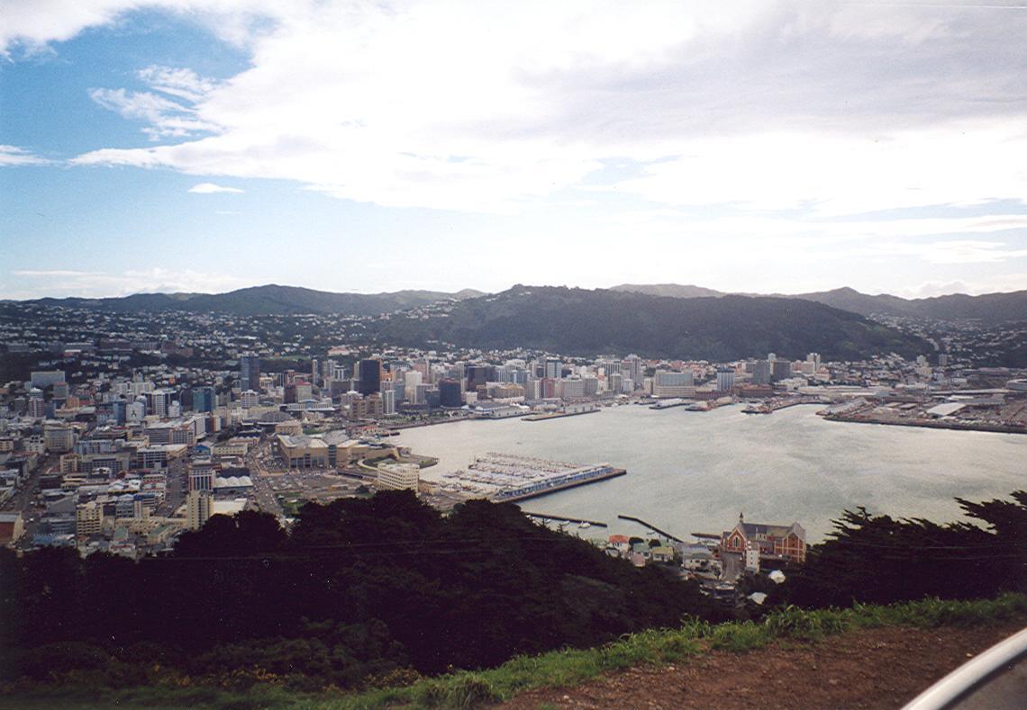 | Wellington Harbour A fairly standard photo of Wellington taken from Mount Victoria. Wellington is built on hills around the harbour, most of the city is not particularly flat. The city centre is in the middle of the photograph and the university is behind it. You can see one of the nice things about the city pretty clearly -- there's a lot of green space within the city limits (the "Town Belt"). The red building in the lower-right corner was a monastery until a couple of years ago. |