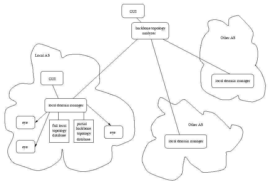As you can see, within each autonomous system, there exists a local domain manager (brain). This brain contains a local topology database (including IP-level topology, history, statistics, whatever else we care to track) and a partial backbone topology containing information about the backbone topology "near" the AS.