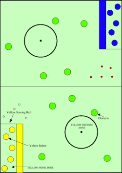 The main goal of RoboFlag is to create an environment where successful strategies must be variable, flexible, and dynamic. Throughout a match, the two teams must adapt their strategies in order to determine which one works best. They will react to score changes, flag captures, and the many other incidents that can occur in the game. Individual robots will perform different functions at different times, with different objectives. The possibilities for innovation are endless. Being a new competition, it is up to Cornell to define the rules and parameters that lead to interesting and challenging problems. Other universities are very interested in this competition and are looking to Cornell to take the lead in making this competition a reality. In this first year, we are using the existing RoboCup robots, as this allows more time for the Intelligence and Control aspects of the project to be developed. In the future, we expect to make mechanical variations to the robots to optimize the performance within the RoboFlag environment. The RoboCup team will always be a source of innovation that will feed RoboFlag, just as RoboFlag will feed RoboCup as the competitions develop. |