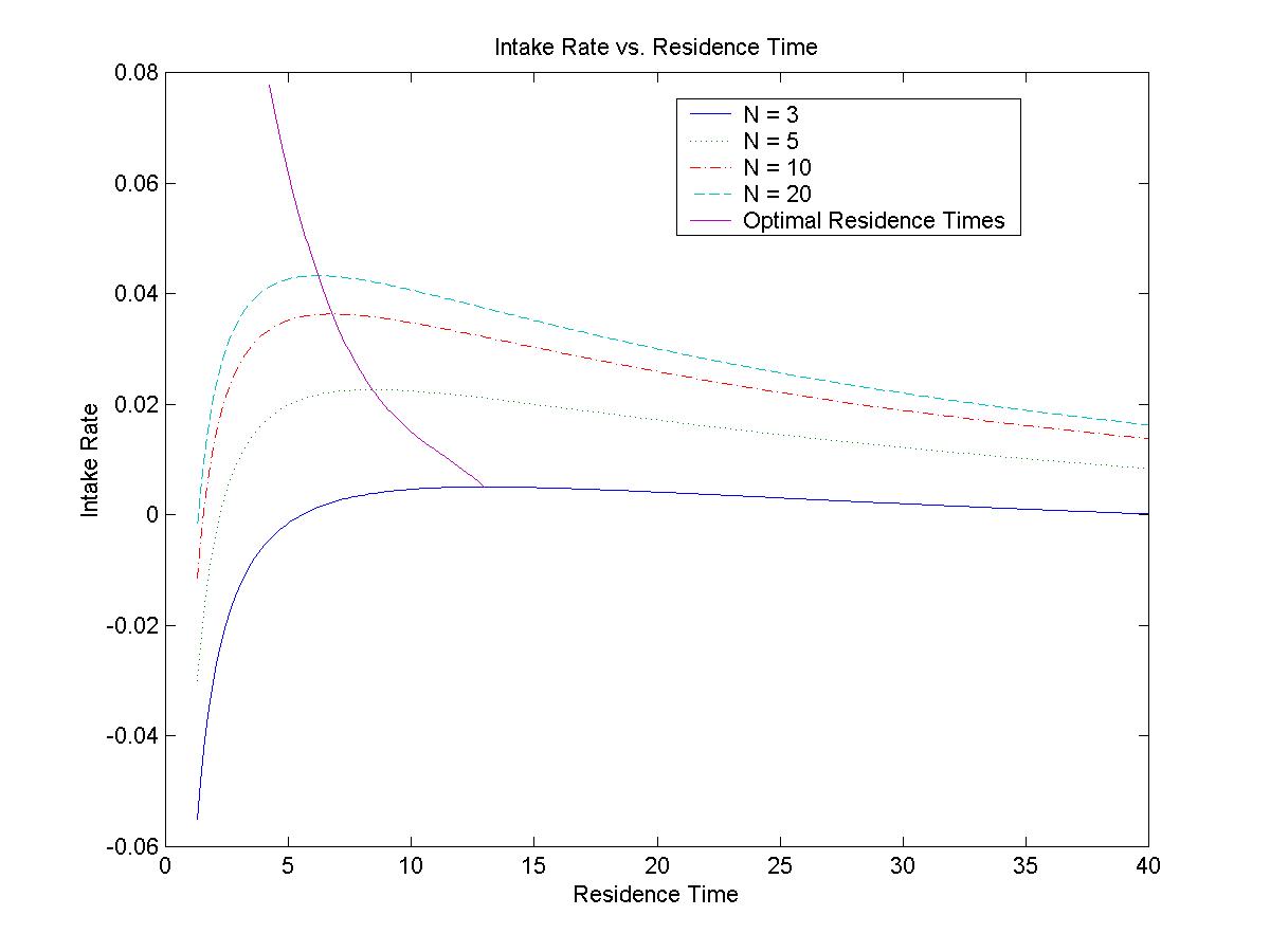 The values obtained from both optimization methods corresponded well since error bounds derived from the error between the fixed-point roots and the endpoints of the optimal residence time intervals shows relatively small differences from each other. The use of IA to simulate a range of parameter states in the system was successful since the percent uncertainties yielded interval optimal residence times. As a result, IA allows the ecologist to vary parameters of the model within certain limitations established by stability analysis and obtain a range of optimal residence times a forager might choose. The percent uncertainty limitations on parameter variation obtained from the stability analysis are high, which is good since it allows a large amount of model variability. IA’s applications to the foraging model include adding more realism to the model through deterministic variability as well as allowing the ecologist to select which parameters are to be uncertain, their range, or different beginning time intervals. The variability is important due to the stochastic nature of ecological process and IA offers an alternative to average state approximations.