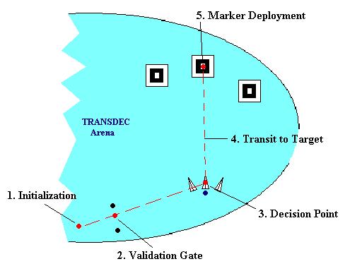During the final phase, we use the two cameras to navigate the submarine directly over the target array. The downward firing altimeter is also employed for accurate depth determination, as the beam spread on the DVL makes it possible to miss the target when it is right beneath the submarine. Once we are aligned with the target, a bank of electromagnets drops two markers. The submarine then surfaces, terminating the mission.