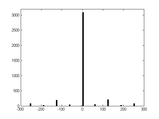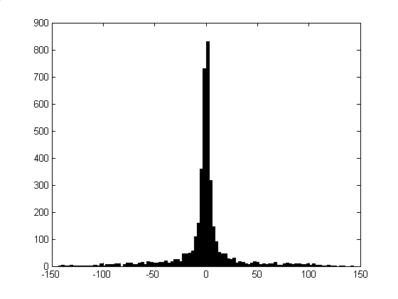 One feature that can be used for the classification of image blocks is based on wavelet coefficient distributions [1]. As shown in Figure 2, the wavelet coefficients in high frequency bands of the Haar Transform tend to follow a Laplacian distribution for pictures, whereas for text, they are concentrated on a few values. Picture blocks have many varieties of transitions between adjacent pixels and thus produce a variety of wavelet coefficients, specifically a Laplacian distribution. Contrarily, text blocks have very few different transitions between adjacent pixels due to the bi-value nature of text. Therefore, only those wavelet coefficients corresponding to the pixel intensity transitions are produced. The classification feature that emerges from these observations is the goodness of fit of the wavelet coefficients to the Laplacian distribution. The goodness of fit can be quantified by the χ2 test. It is interesting to note that the wavelet transform maintains spatial and frequency information, but making a histogram of the coefficients discards the spatial content. Also, histograms of the difference between adjacent pixels show the same trends: picture blocks have Laplacian distribution, and text blocks have distributions concentrated at certain values.