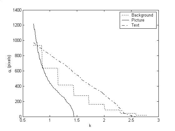Figure 4: Active pixels (α) as a function of k for trial postal image blocks.