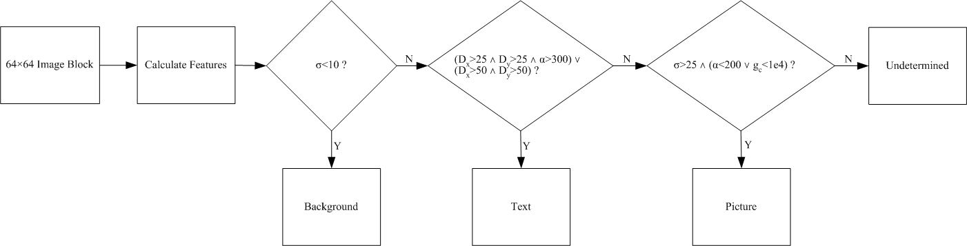 I selected the 6 features μ, σ, α, Dx, Dy, and gc to use as the basis for classification. All are computationally fast and provide different types of information. I randomly selected 10 64×64 image blocks of each category: picture, text, and background, from the database of images produced by the postal systems of Lockheed Martin Distribution Technologies (Owego, NY). After calculation of the six features for the image blocks, I developed a decision tree, shown in Figure 7, by inspection. More rigorous and elegant techniques may be employed in the future for better classification.