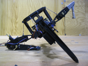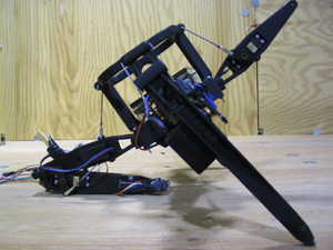All candidate solutions started from the initial state shown below. Only one leg of the robot is active, the other legs have their servo motors locked and sensors disabled. The shank of the leg opposite the active leg is detatched, creating balancing problems. The outputs of the touch and angle sensors on the active leg are fed into the FPAA neural net. The signals output by the neural net are converted to PWM signals and sent to the active leg's servo motors. See paper for more details.