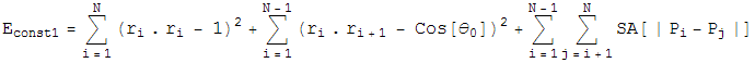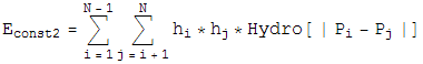 The AlgorithmConstraint 1 --- Have all the bond lengths and bond angles correct, and have no spheres overlapping Constraint 2 --- Have the attractive hydrophobic-hydrophobic energy below a specified amount Assume for a moment you have a collection of monomers that satisfy neither constraint. It is relatively easy to minimally move the monomers so contraint 1 is satisfied, or to minimally move the monomers so contraint 2 is satisifed, but trying to satisfy both at the same time is very difficult. This is the purpose of the iterative search algorithm. So if a problem can be phrased as searching for the intersection of two contraint spaces, and distance minimizing projections can be efficiently computed for these constraint spaces, then the iterative search algorithm will find their intersection fairly quickly. A distance minimizing projection is defined as follows: given an collection of monomers (an iterate) that does not satisfy a constraint, find the smallest change to the position of the monomers so that the iterate does satisfy the constraint. The "smallest change" is that which minimizes the sum of euclidian distances moved by all the monomers. In the context of protein folding, these projections are defined as follows: For Constraint 1, Define an energy, ![]() ![]() ![]() ![]() which is the sum of the bond lenth and bond angle constraints, and the self avoiding energy whose functional form is plotted. We simpliy let this energy be minimized by a greedy energy minimization scheme. All three energy terms go to zero for a protein satisfying constraint 1, so we let this energy be minimized until the total energy is sufficiently close to zero. In practice, these three energy terms are mild enough that frustration is not a problem. For Constraint 2, Define an energy, ![]() ![]() ![]() which is the attractive hydrophobic-hydrophobic interaction energy. Notice if a monomer is hyrdophillic, h=0, so the monomer contributes no energy to this sum. The only energies come from two hydrophobic balls, and the interaction energy is plotted. We also let this energy be minimized by a greedy energy minimization scheme. Since during this minimization, the bond length is allowed to vary from 1 unit, and the bond angle is allowed to be different from the specified amount, the minimization is not frustrated, and almost always finds the global minimum. Once the two projections for the two constraint spaces have been worked out, the iterative search algorithm is defined in terms of these projections as: ![]() ![]() ![]() ![]() Beta is a dimensionless parameter that specifies the relative strength of the two contraints, that is, the optimum value for beta depends on how much work each projection on average does. Notice that if d=0, then the iterate no longer evolves, a fixed point has been found. Notice also that if d=0, a point that lives on the first constraint space, P1(F2), is the same as a point on the second constraint space, P2(f1). So a point living on both constraint spaces has been found! Notice finally that the iterate will continue evolving utill this happens. There are no other fixed points except for the solution. The various plus and minus signs in the above equation have been worked out so the solution is an attractive fixed point, and near-solutions are NOT fixed points. |