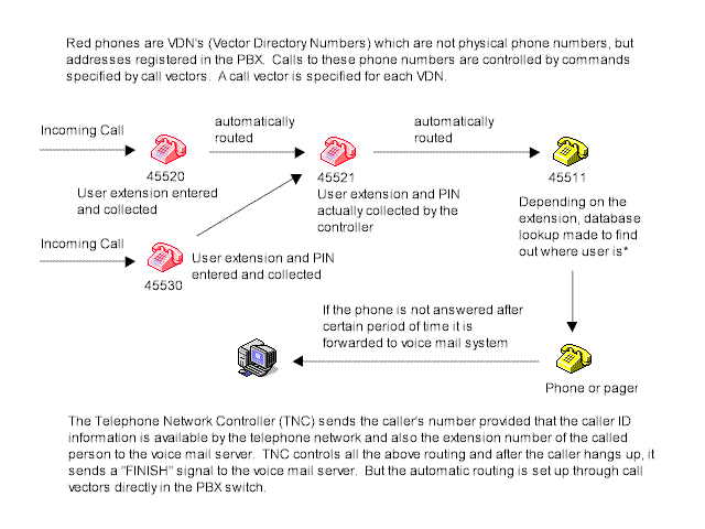 The TNC monitors 45521 to collect the extension number or extension number and PIN number in case the user wants to change his answering message. TNC also determines the calling number and forwards these numbers to the voice mail server through socket connection. After acknowledgement is received TNC actually forwards the call to the voice message server to either leave voice mail or change answering message. After the user hangs up TNC informs this to the voice mail server.