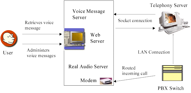 As seen in the diagram above, the whole process begins when the PBX controller notices that no one is answering a call. The PBX controller notifies the Message Server through a socket connection. The notification process includes the phone number of the caller and the callee. The call is then forwarded to the Message Server in the data plane. The server converts the analog signal into a .wav file and then into a RealAudio file. An email message is then sent to the student notifying him of his message. The student can then retrive the RealAudio file from the Internet.