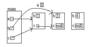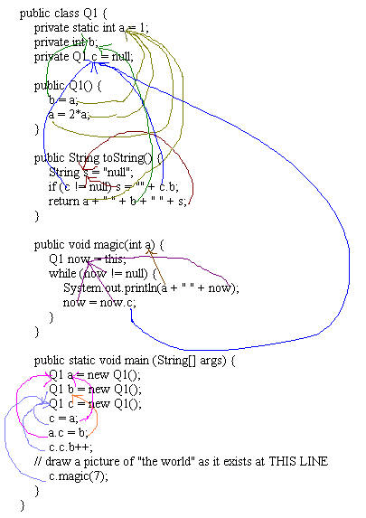 ANSWERS: 1. a) ![]() b) 7 8 1 3 7 8 3 null 2. a) ![]() b) toString returns a value. to print a value, it would be: public void toString() { String s = "null"; if (c != null) s = "" + c.b; System.out.println(a + " " + b + " " + s); } NOTE: Java requires toString to return a String. c) A "class" is "model" or "blueprint" that defines the fields (or instance variables) and methods of its instances (objects). d) A "method" is a named piece of code that performs a task; it can take values as parameters (or arguments) and can return a result value. e) "public" means "can be seen by code anywhere". "private" means "can be seen only by code within the class". f) "static" means "only one copy, only accessible through/within the class". "non-static" means one copy per instance, only accessible via (a reference to) an object. 3. a) // repeatedly do something N times int counter = 0; while (counter < N) { do-something; counter++; } // process input sequence of pairs of values // terminated by a pair (stop1,stop2) of stopping values int a = in.readInt(); int b = in.readInt(); while (a != stop1 || b != stop2) { process-a-and-b; a = in.readInt(); b = in.readInt(); } b) int trurl = 0; // y position of trurl int klapaucius = 0; // y position of klapaucius int x = 0; // #steps; also, x position of trurl, klapaucius int same = 0; // how often trurl and klapaucius meet while (x < 200) { if (Math.random()<.6) trurl++; else trurl--; if (Math.random()<.45) klapaucius++; else klapaucius--; if (trurl == klapaucius) same++; x++; } System.out.println("They met " + same + " times"); 4. a) Note: The fields below are public to allow code outside the class the modify them, but this is BAD style: They should be private, and there should be methods for setting and getting the fields. This way, the MM60 code can enforce the specified contraints (ranges) on the fields. public class MM60 { public int tens; public int ones; public MM60 add(MM60 b) { MM60 c = new MM60 (); c.ones = ones + b.ones; c.tens = (tens + b.tens + c.ones / 10)%6; c.ones %= 10; return c; } public void swap(MM60 b) { int tmp; tmp = ones; ones = b.ones; b.ones = tmp; tmp = tens; tens = b.tens; b.tens = tmp; } } b) a.swap(b); b.swap(c); OR a.swap(c); a.swap(b); OR b.swap(c); a.swap(c); NOTE: x.swap(y); has the same effect as y.swap(x); thus, the code above could be b.swap(a); c.swap(b); OR c.swap(a); b.swap(a); OR c.swap(b); c.swap(a); c) MM60 a = new MM60(); int m = (-x) % 60; if (m<0) { m += 60; m %= 60; } a.ones = m % 10; a.tens = m / 10; NOTE: it would have been bad style to modify x. d) a.add(a).add(c) <-- no semicolon, since this is an expression |