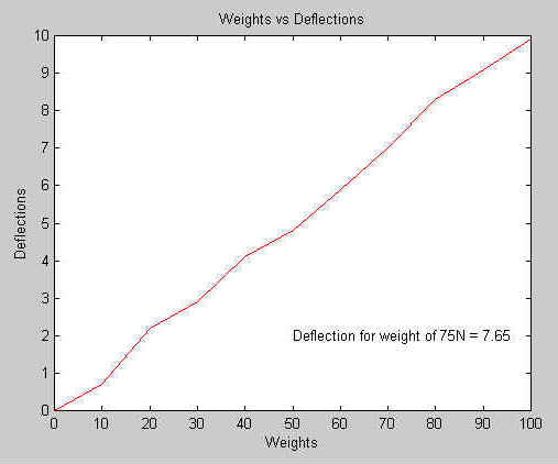 Note: For this assignment, it suffices to get the value for the deflection by "eyeballing" the graph. A better solution might be to linearly interpolate the values for 70N and 80N. An even better solution might be to perform a least-square fit of a line through all the points and then compute the value for 75N.