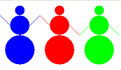 /***************************************************************************** * p1PartC.java * *****************************************************************************/ import java.awt.*; public class p1PartC { public static void main(String[] args) { Drawing d = new Drawing(); // create object for drawing graphics d.setTitle("Drawing Window"); // set title of Drawing window d.setSize(400,200); // set size of Drawing window d.show(); // display/show window (starts off hidden) } } class Drawing extends Frame { public void paint(Graphics g) { // Drop below window title bar: g.translate(getInsets().left, getInsets().top); // Draw leftmost snowperson: g.setColor(Color.blue); // was: g.setColor(Color.red); g.fillOval(40-10, 10, 20, 20); g.fillOval(40-20, 30, 40, 40); g.fillOval(40-30, 70, 60, 60); g.drawLine(20, 50, 20-20, 50-20); g.drawLine(60, 50, 60+20, 50-20); // Draw middle snowperson: g.setColor(Color.red); // was: g.setColor(Color.green); g.fillOval(80+40-10, 10, 20, 20); g.fillOval(80+40-20, 30, 40, 40); g.fillOval(80+40-30, 70, 60, 60); // Draw arms: g.drawline(80+20, 50, 80+20-20, 50-20); g.drawline(80+60, 50, 80+60+20, 50+20); // Draw rightmost snowperson: g.setColor(Color.green); // was: g.setColor(Color.blue); g.fillOval(2*80+40-10, 10, 20, 20); g.fillOval(2*80+40-20, 30, 40, 40); g.fillOval(2*80+40-30, 70, 60, 60); g.drawLine(2*80+20, 50, 2*80+20-20, 50+20); g.drawLine(2*80+60, 50, 2*80+60+20, 50+20); } }