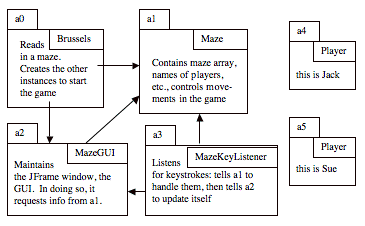 You can download a finished version of this game from the website or just click here: brussels.jar (At some point, we will show you how you can make your own Java programs into jar files.) Here are two mazes that you can play with: bigmaze.txt littlemaze.txt. Put these two mazes in a directory, along with brussels.jar. When the game starts, it asks for a maze to play with, using a dialog window; use that dialog box to navigate to the appropriate directory and select one of the mazes.