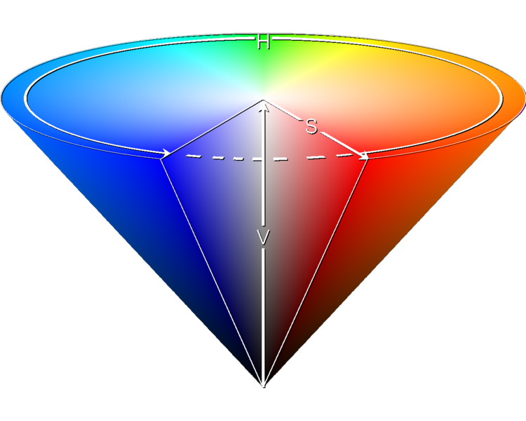 HSV can be explained in terms of the cone that appears to the right.