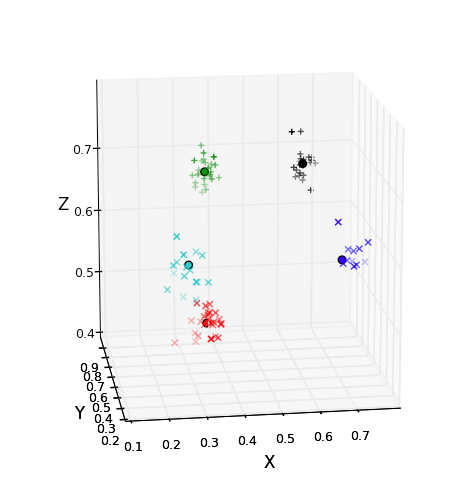 space. These points are color-coded into five clusters, with all the points in a cluster being