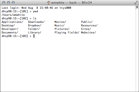 To get the Terminal to do something, simply type in a command, and hit Return. The shell will then process the command, either doing something or printing out an error message. When done, it will present the prompt again, ready for you to type in a new command. As we mentioned above, the Command Prompt works a lot like the Finder. At any given time it is open to a specific folder (or directory) on your computer, which we call the working directory.