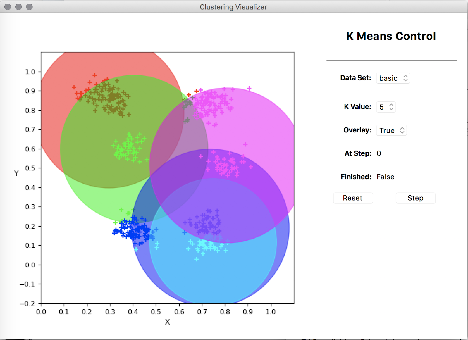 Once you complete both parts, you will see that the visualizer has a lot more functionality. When you load up a data file and click the Reset button, you will see all points in the data set as blue markers in the plot window. In addition, you will see a small blue circle with black border representing an initial centroid. Finally, you can turn the small blue circle into a big one by choosing the overlay option.