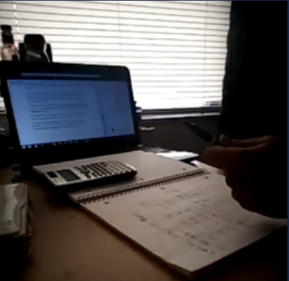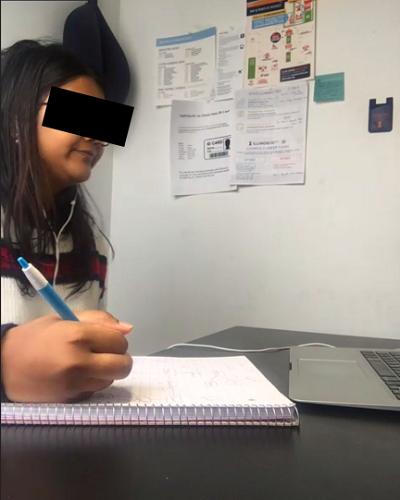 The set-up below is unacceptable because the lighting is poor and we cannot see the student’s face. The camera should never point to a light source (i.e. the window). It is also unacceptable to use of a notebook. You should use loose sheets of paper only.