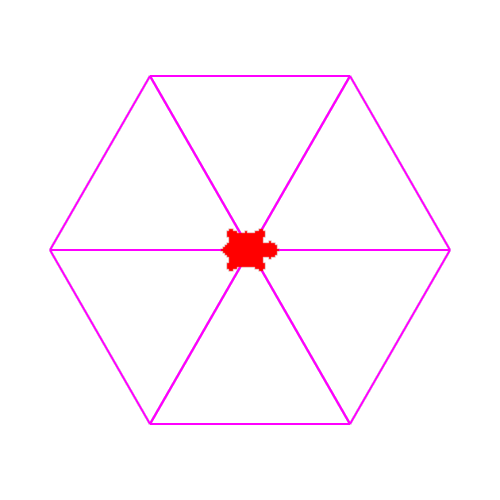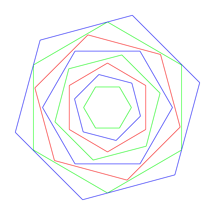 The important thing to understand about the Gosper island is that the recursion is not applied to the hexagon. It is applied to the edges. The basic edge is a straight line. Later shapes break the edge into three segments creating a “zig-zag”. These three segments are themselves Gosper edges of one less depth.