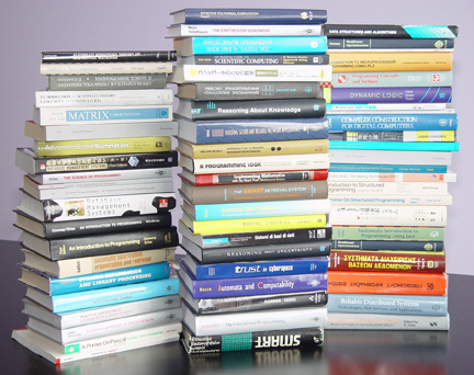 Textbooks | Cornell faculty often write texts for the courses they teach, and some are quite prolific. The CS Department faculty wrote over 75 books in the first 40 years of the department (all piled up to the right; you can read some of the titles in an enlarged image by clicking on the image to the right). Other departments are also well-known for their contributions to course materials. In this assignment, you will maintain information about textbooks. | ![]() |