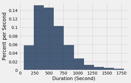 The histogram below shows that most of the trips took around 10 minutes (600 seconds) or so. Very few took near 30 minutes (1800 seconds), possibly because people try to return the bikes before the cutoff time so as not to have to pay.