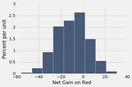 Table().with_column('Net Gain on Red', net_gain).hist()