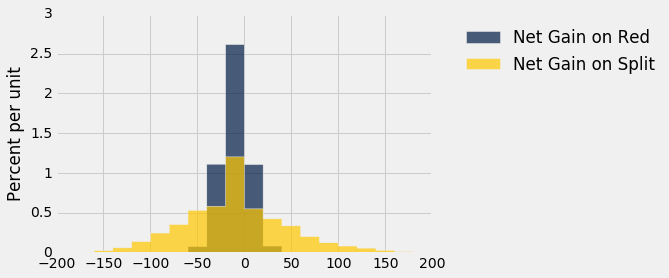However, the chance of making money is larger for the split bet, as is the chance of making more than \$50. The gold histogram has plenty of area to the right of \$50, whereas the blue histogram has almost none. So should you bet on the split instead?