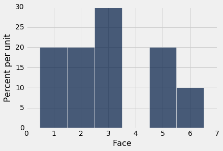 Here is an empirical histogram of 10 rolls. It doesn't look very much like the probability histogram above. Run the cell a few times to see how it varies.