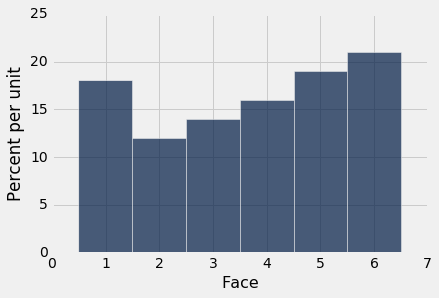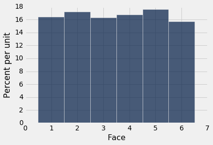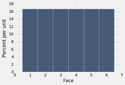 Before going further, let's make sure that the numbers on the axes make sense. The probability of each face is 1/6, which is 16.67% when rounded to two decimal places. The width of each bin is 1 unit. So the height of each bar is 16.67% per unit. This agrees with the horizontal and vertical scales of the graph.