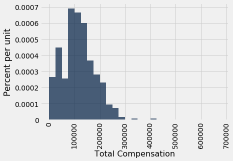 Let this table of just over 36,500 rows be our population. Here is a histogram of the total compensations.