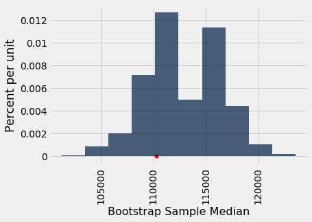 Here is the histogram of the 5000 medians. The red dot is the population parameter: it is the median of the entire population, which we happen to know but did not use in the bootstrap process.