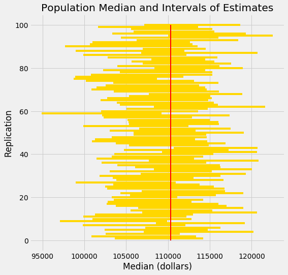 Remember also that the point of all these computations is to estimate the population median, which is the red dot. Our estimates are all the randomly generated sampled medians whose histogram you see above. We want those estimates to contain the parameter – it they don't, then they are off.