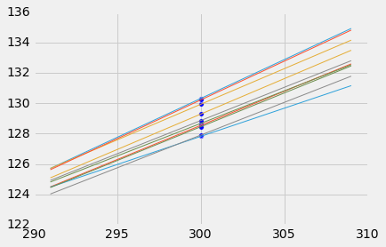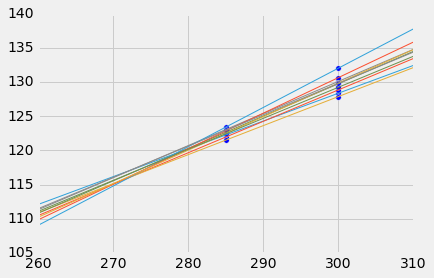 To do this, we must generate new samples. We can do that by bootstrapping the scatter plot as in the previous section. We will then fit the regression line to the scatter plot in each replication, and make a prediction based on each line. The figure below shows 10 such lines, and the corresponding predicted birth weight at 300 gestational days.