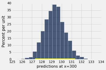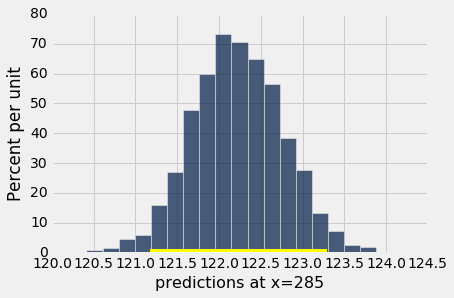 So 285 is nearer to the center of the distribution than 300 is. Typically, the regression lines based on the bootstrap samples are closer to each other near the center of the distribution of the predictor variable. Therefore all of the predicted values are closer together as well. This explains the narrower width of the prediction interval.