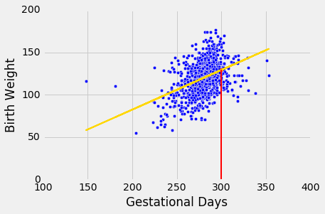 fit_300 = fitted_value(baby, 'Gestational Days', 'Birth Weight', 300)