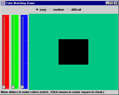 JRadioButton easy,medium,difficult; // Game level (4, 8, or 16 color-levels) JSlider red,green,blue; // Color controls JPanel goalPanel; // Where goal color appears JPanel guessPanel; // Where guess color appears JLabel winLabel; // Used to indicate winning JLabel messageLabel; // Where messages appear ColorGame game; // Current color game
