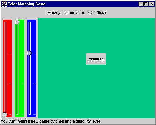 The sliders and the radio buttons correspond to the obvious components shown in the picture above. The goalPanel is the large outer square containing the goal color. The guessPanel is the small inner square. The winLabel does not appear above, but it shows up inside the guessPanel when someone wins the game (i.e., matches the goal color). The messageLabel contains the message that appears at the bottom of the window. The contents of the messageLabel change during the game in order to provide information to the player/user. The game represents the current ColorGame. Here's another picture of the game showing the winLabel in the guessPanel and showing a different message in the messageLabel.
