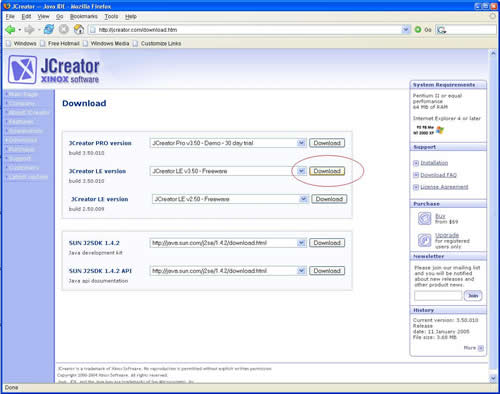 To install JCreator, first you must install java. Please note the location where Java is placed on your computer, typically C:\Program Files\Java\jdk1.5.0_01. Next head over to www.JCreator.com and click on the Download link. On the download page, select JCreator LE version. The PRO version is $29 for students or you can try the 30 day trial version. The only differences between the two versions are added convenience features (automatic code completion, etc).