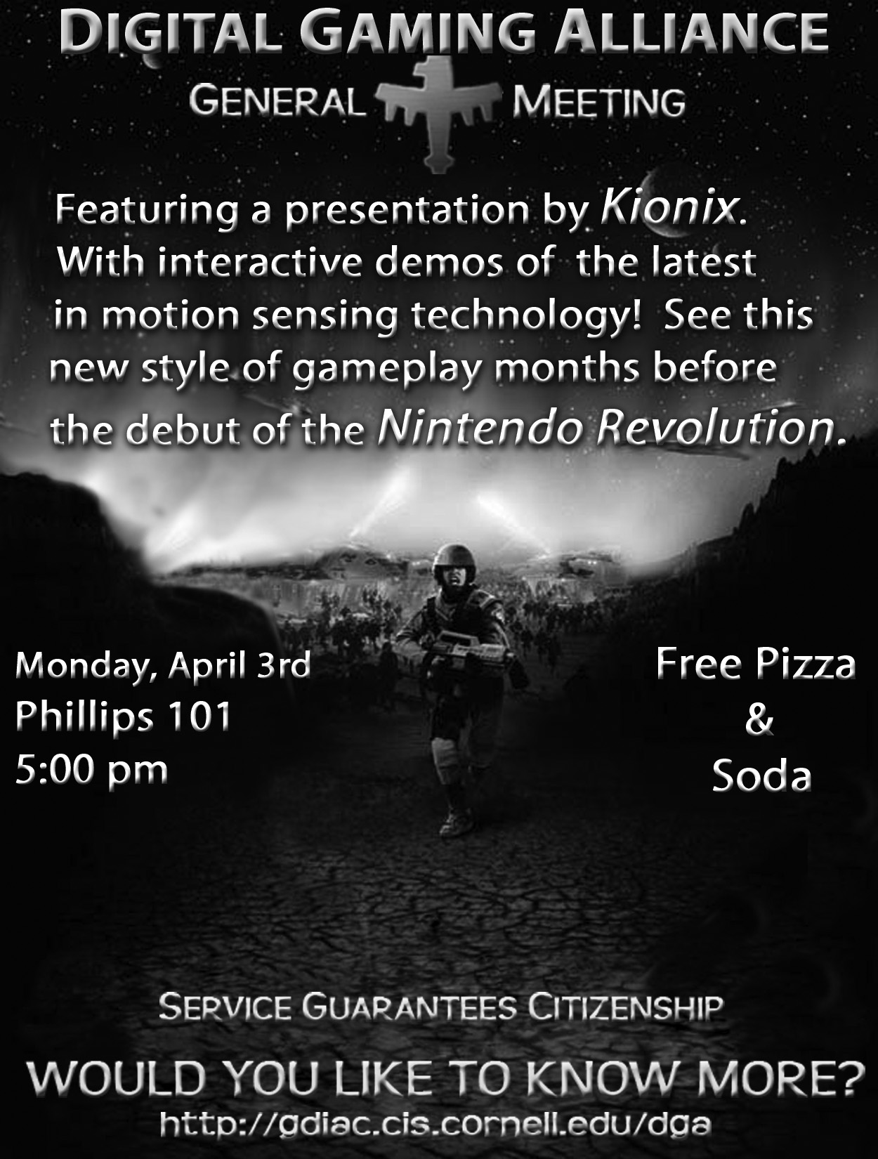 DGA Meeting! | Cornell has a new videogame student organization! Their first meeting is on Mon. Look here for more details. | |
