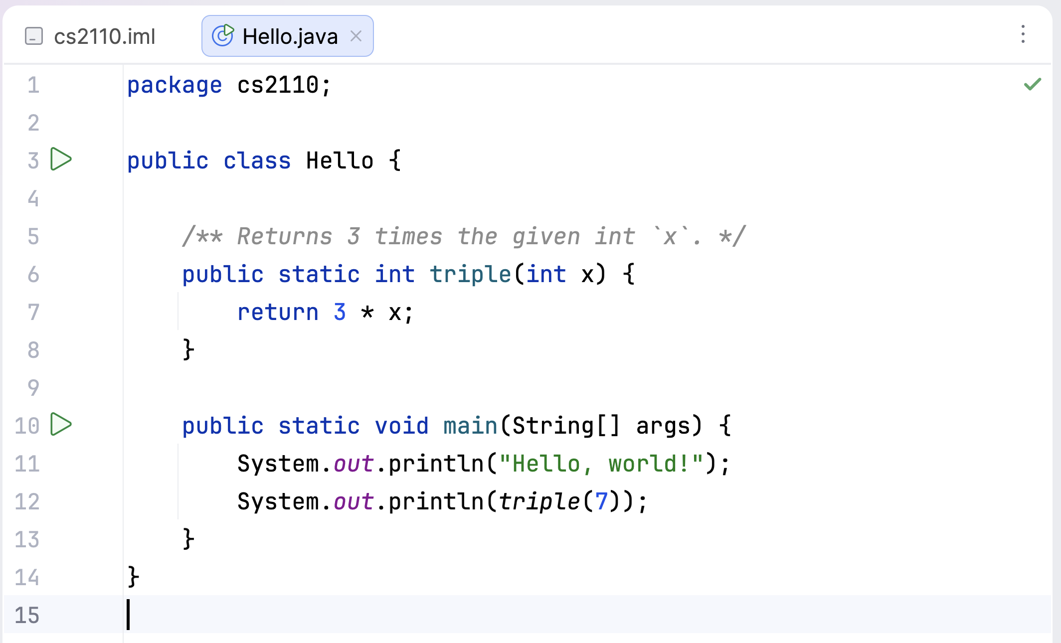 As we will discuss, the standard entry point of a Java program is a method with the signature public static void main(String[] args). When we include a method with this signature, IntelliJ will add a green “play button” next to it.
