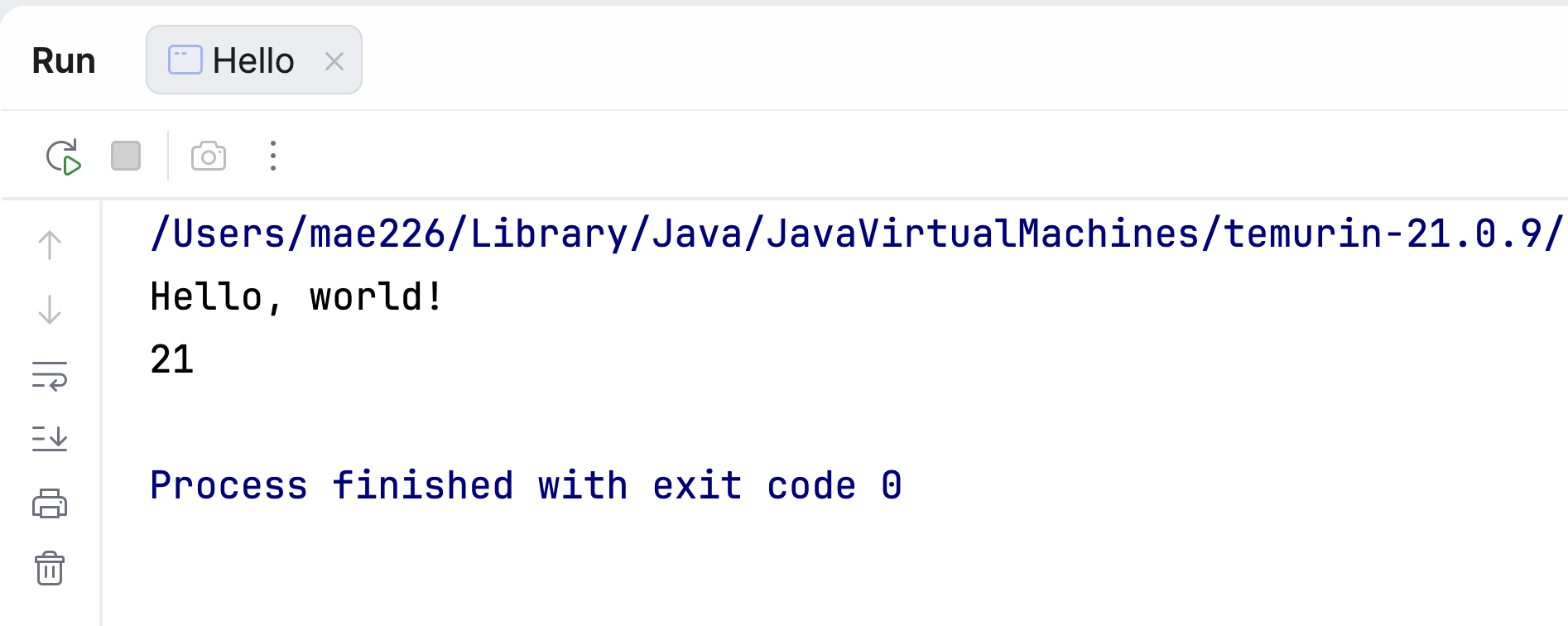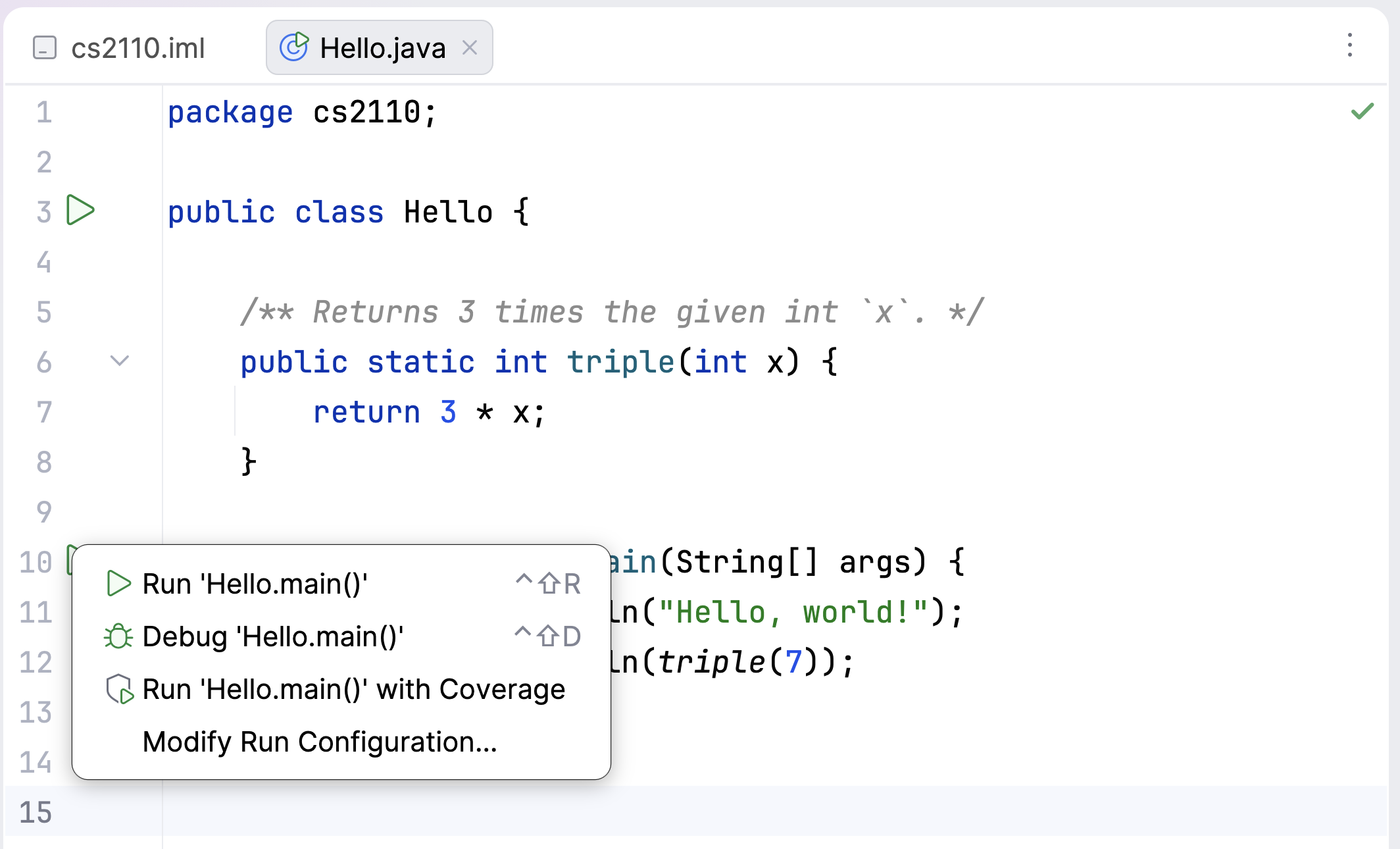 Alternatively, you can click the green play button next to the class declaration (line 3 here) to run that class’s main() method. You can also right-click the class name in the left file explorer and select “Run ⟨class name⟩.main()”. When this Hello program is run, it prints to the console. You’ll see a “Run” panel appear at the bottom of the screen displaying the console output.