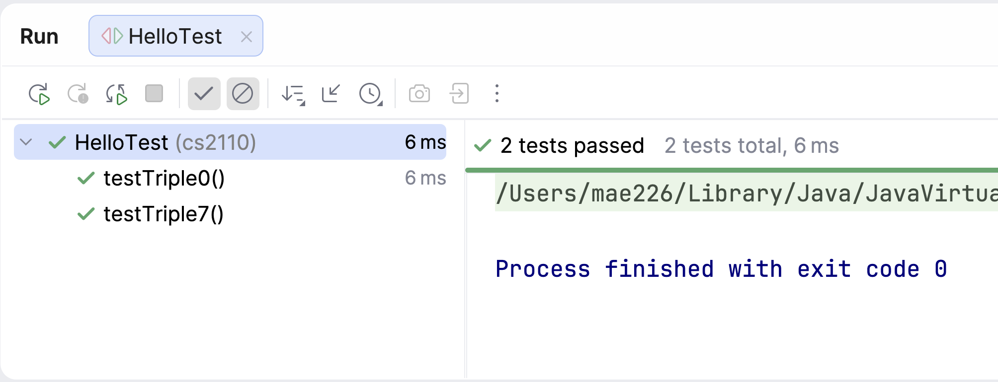 Within the tests folder, you’ll find Java classes containing JUnit tests. If you open one of these files, you’ll see methods labeled with an @Test annotation (i.e., unit tests). Next to each of these methods, you’ll see a green play button that will allow you to run that test (only). Each class containing at least one unit test will have a green “double play button” next to its declaration. Clicking this allows you to run all of the tests within that class.